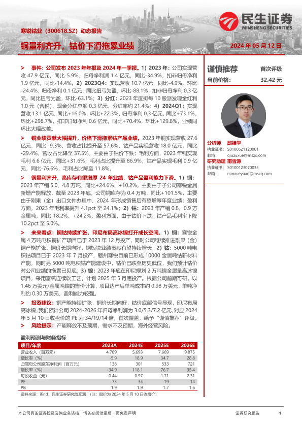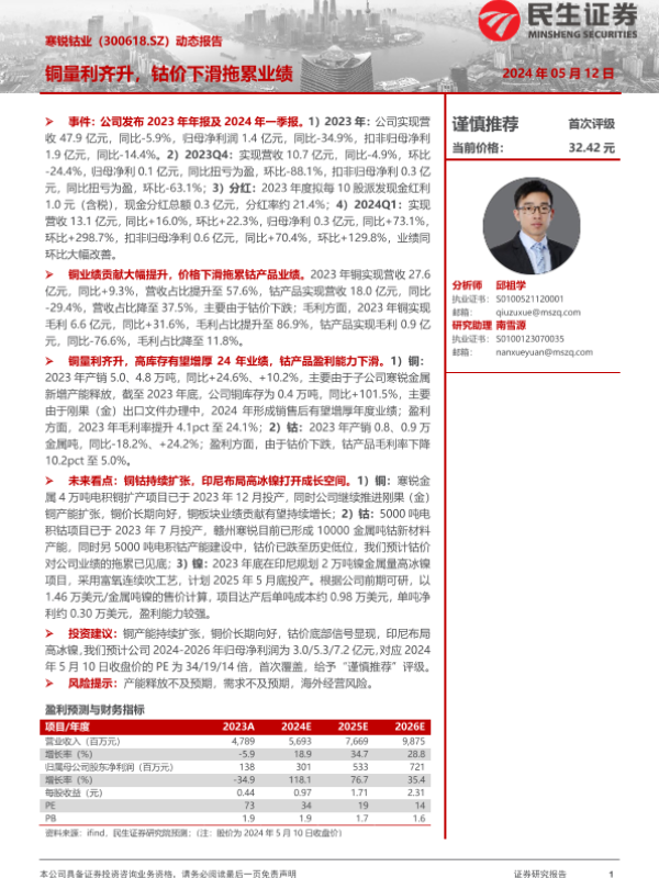 【民生证券】【20240512】寒锐钴业(300618)动态报告:铜量利齐升,钴价下滑拖累业绩-13页