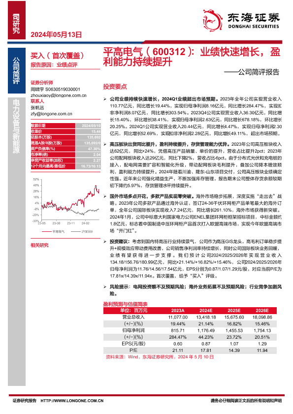 【东海证券】【20240513】平高电气(600312)公司简评报告:业绩快速增长,盈利能力持续提升-10页