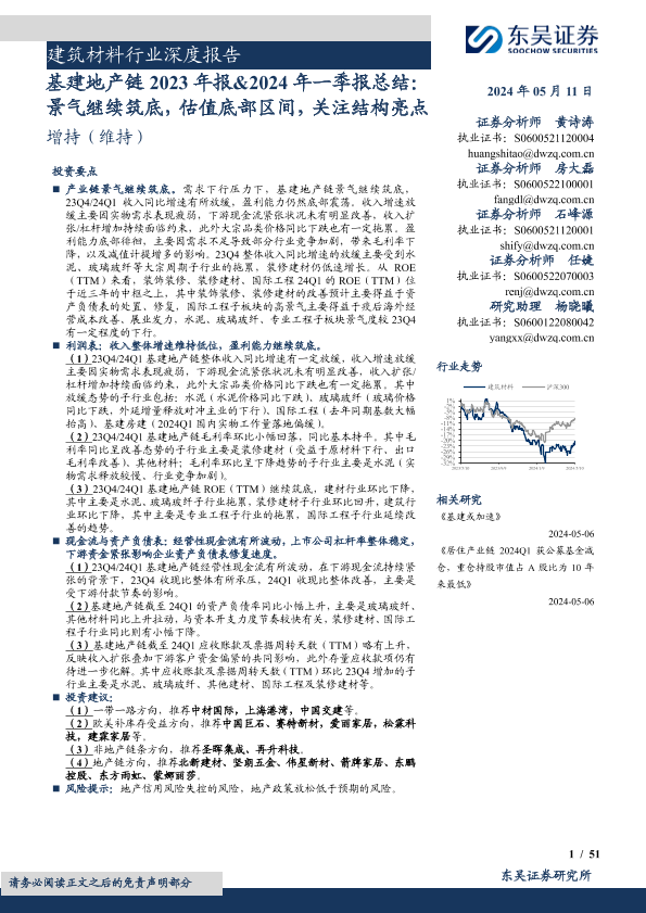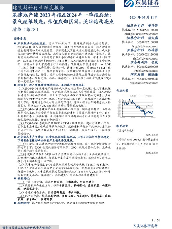 【东吴证券】【20240511】建筑材料行业深度报告:基建地产链2023年报&2024年一季报总结,景气继续筑底,估值底部区间,关注结构亮点-51页