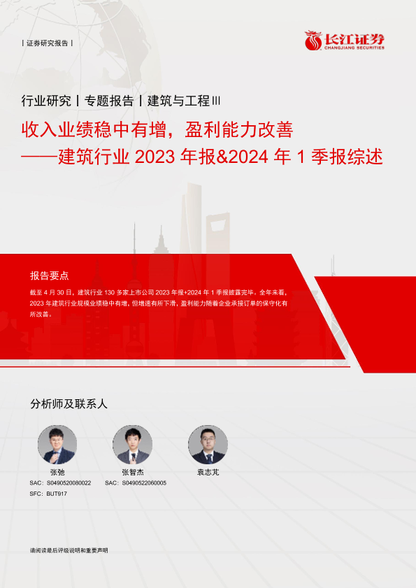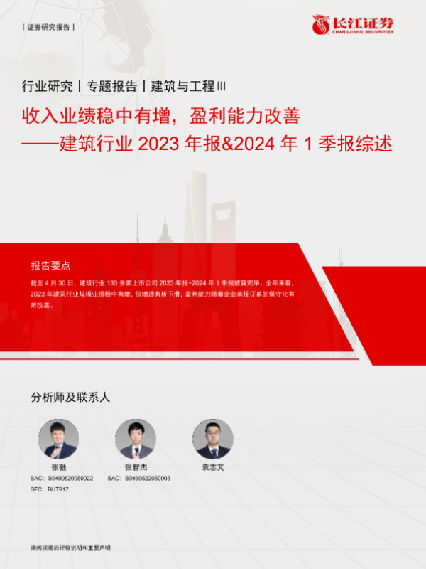 【长江证券】【20240514】建筑行业2023年报&2024年1季报综述:收入业绩稳中有增,盈利能力改善-23页