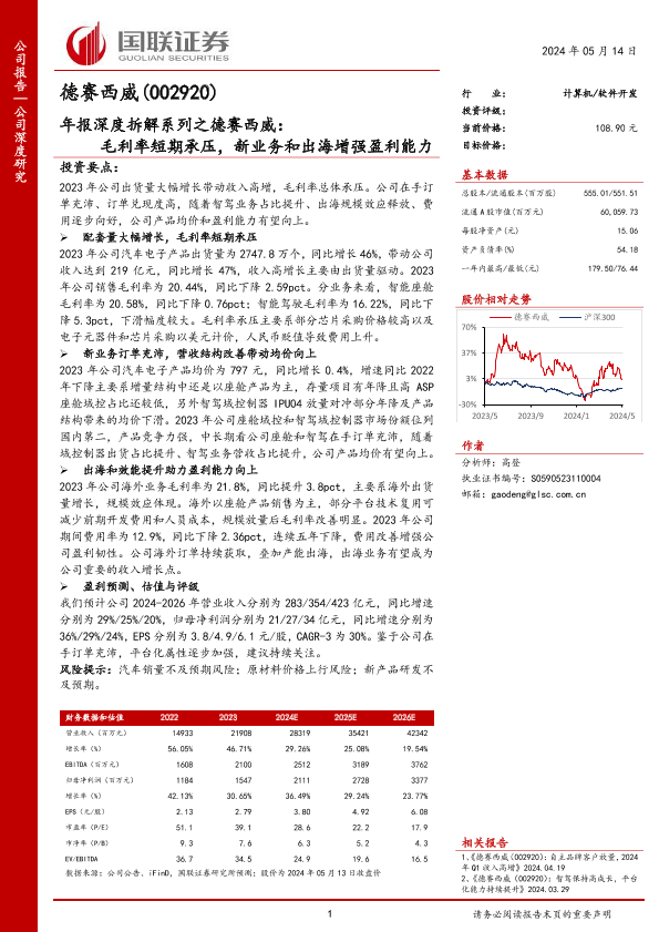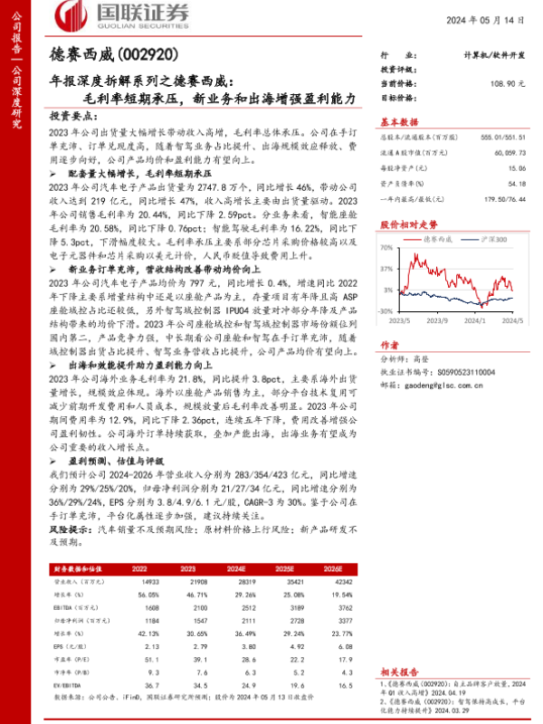 【国联证券】【20240514】德赛西威(002920)年报深度拆解系列之德赛西威:毛利率短期承压,新业务和出海增强盈利能力-17页