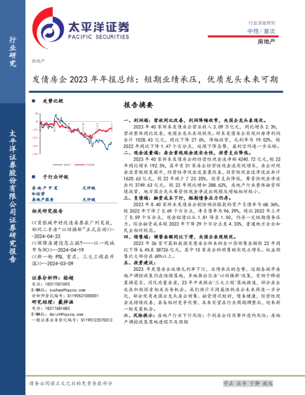 【太平洋证券】【20240515】房地产行业发债房企2023年年报总结:短期业绩承压,优质龙头未来可期-14页