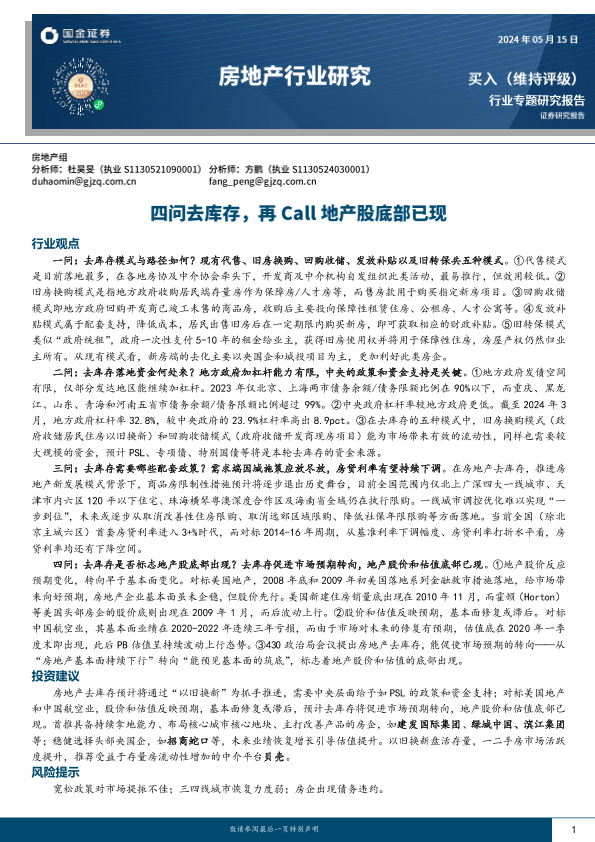 【国金证券】【20240515】房地产行业专题研究报告:四问去库存,再Call地产股底部已现-18页
