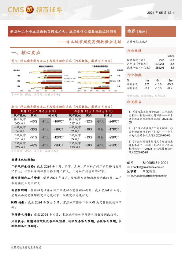 【海通证券】【20240512】房地产行业样本城市周度高频数据全追踪:新房和二手房成交面积负同比扩大,成交量信心指数低位边际回升-12页