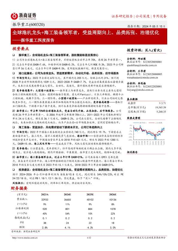 【浙商证券】【20240515】振华重工(600320)深度报告:全球港机龙头+海工装备领军者,受益周期向上、品类拓张、治理优化-32页