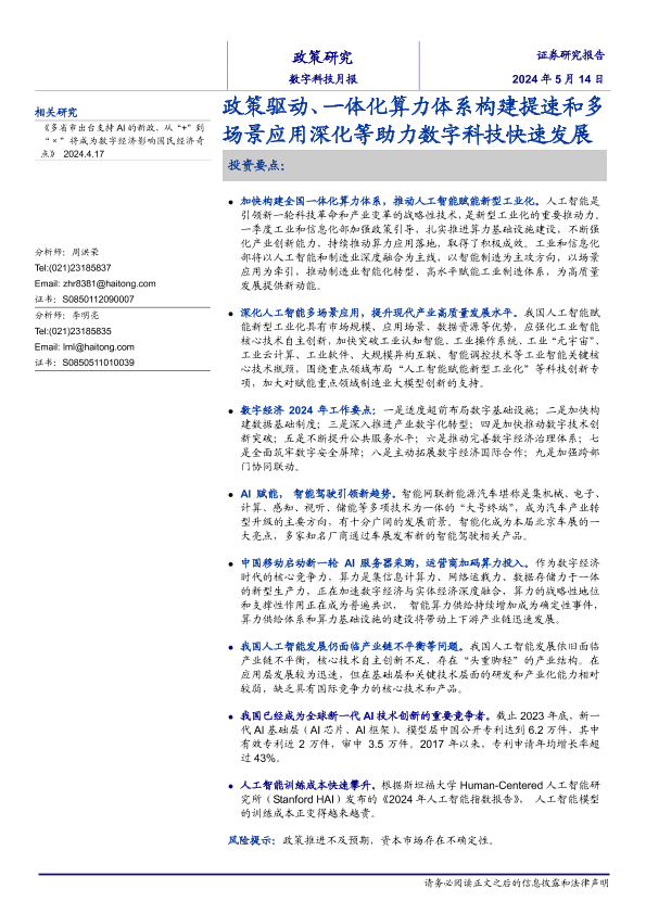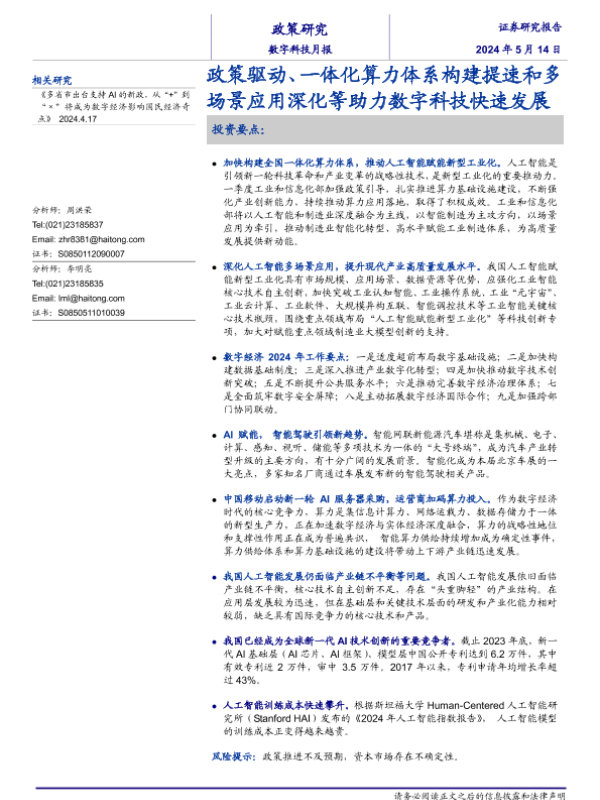 【海通证券】【20240514】数字科技月报:政策驱动、一体化算力体系构建提速和多场景应用深化等助力数字科技快速发展-26页