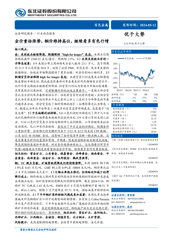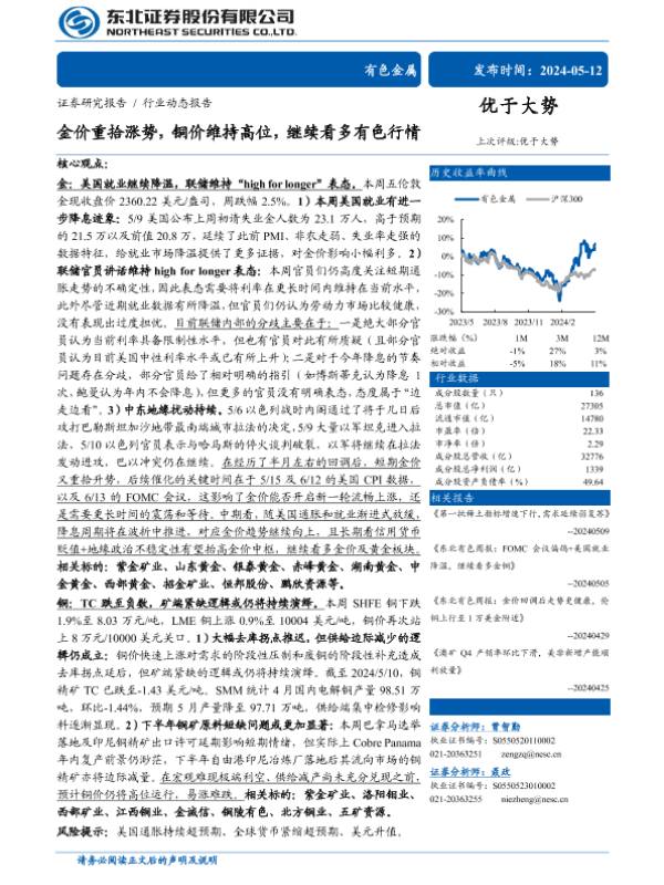 【东北证券】【20240512】金价重拾涨势,铜价维持高位,继续看多有色行情-22页