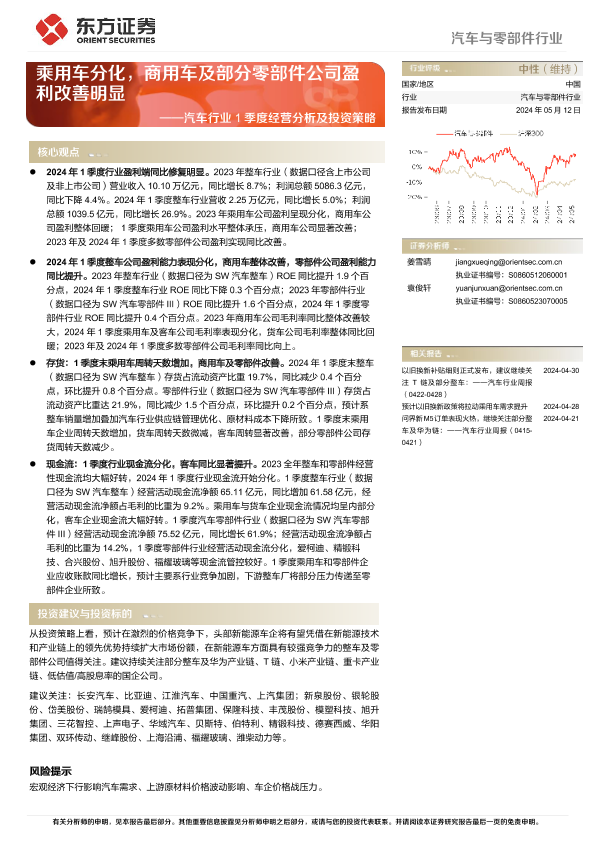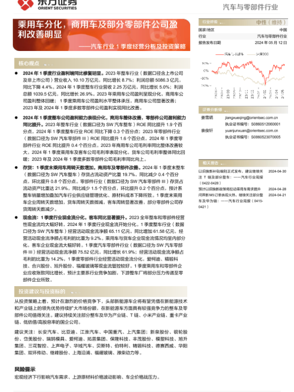 【东方证券】【20240512】汽车行业1季度经营分析及投资策略:乘用车分化,商用车及部分零部件公司盈利改善明显-24页