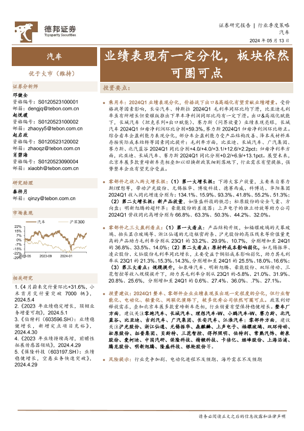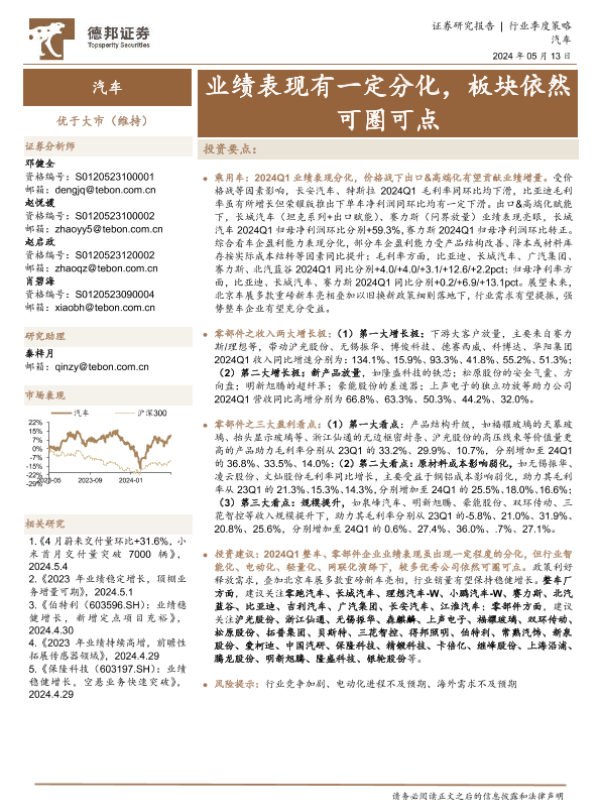 【德邦证券】【20240513】汽车行业季度策略:业绩表现有一定分化,板块依然可圈可点-37页