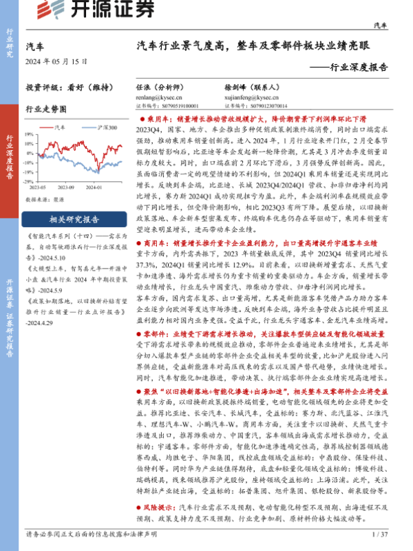 【开源证券】【20240515】汽车行业深度报告:汽车行业景气度高,整车及零部件板块业绩亮眼-37页