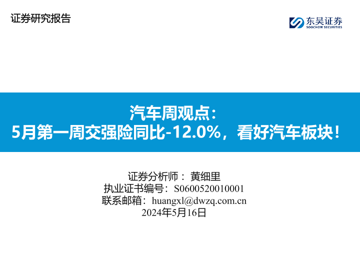 【东吴证券】【20240516】汽车行业观点:5月第一周交强险同比-12.0%,看好汽车板块!-29页