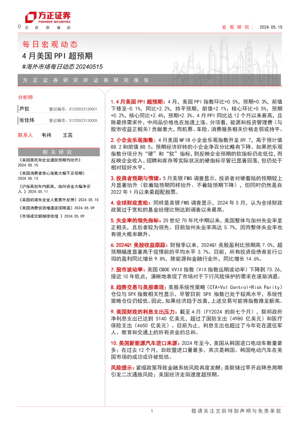 【方正证券】【20240515】海外市场每日动态:4月美国PPI超预期-10页