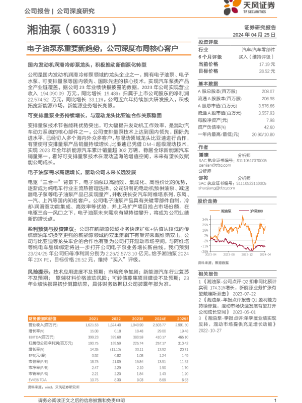 【天风证券】【20240425】湘油泵-603319.SH-电子油泵系重要新趋势,公司深度布局核心客户-21页