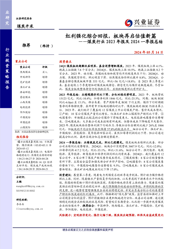 【兴业证券】【20240514】煤炭行业2023年报及2024一季报总结:红利强化综合回报,板块再启估值新篇-27页