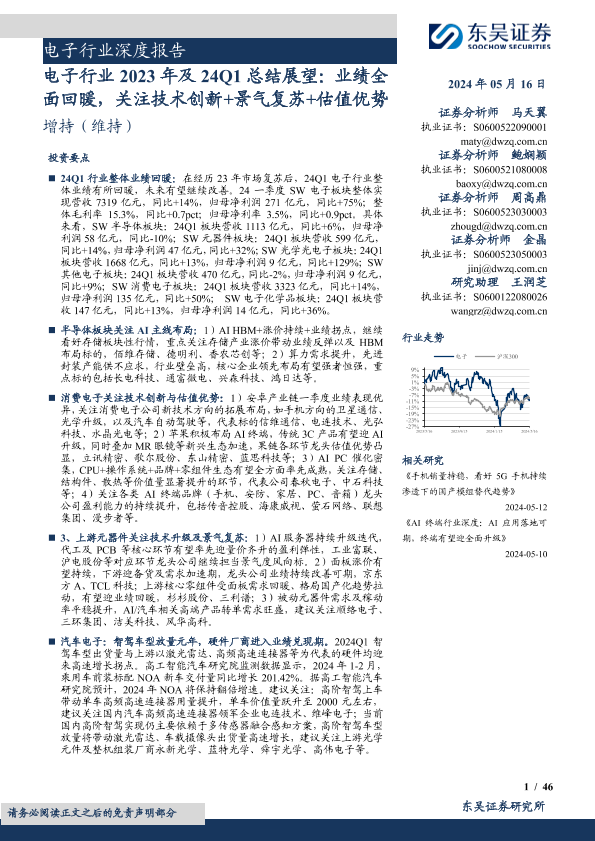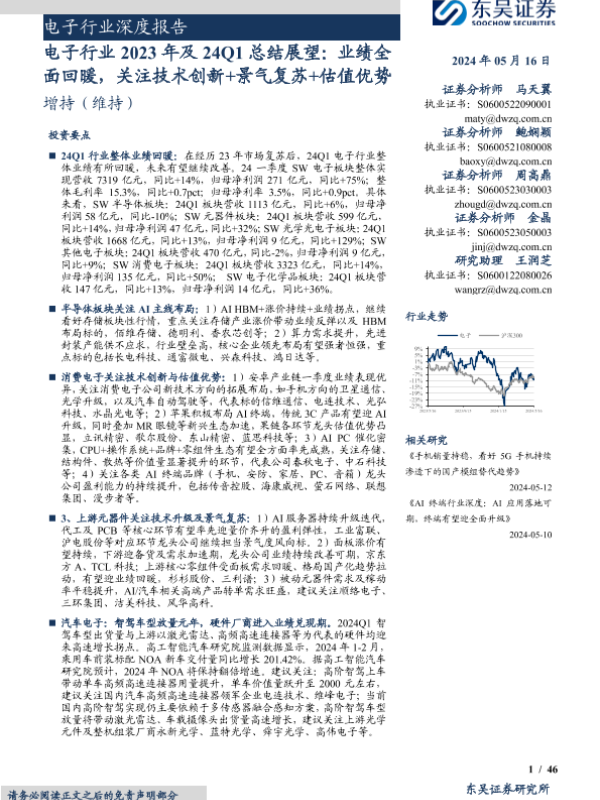 【东吴证券】【20240516】电子行业2023年及24Q1总结展望:业绩全面回暖,关注技术创新+景气复苏+估值优势-46页