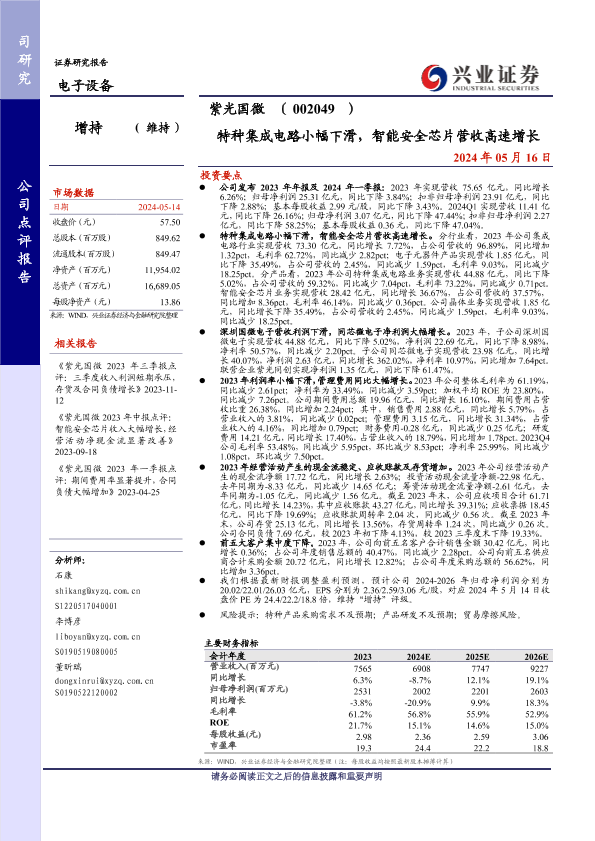 【兴业证券】【20240516】紫光国微(002049)特种集成电路小幅下滑,智能安全芯片营收高速增长-10页