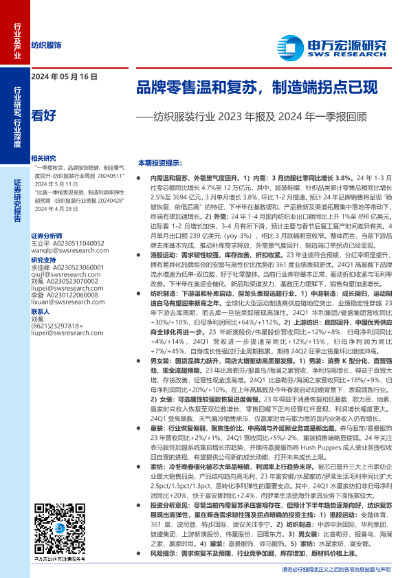 【申万宏源】【20240516】纺织服装行业2023年报及2024年一季报回顾:品牌零售温和复苏,制造端拐点已现-32页