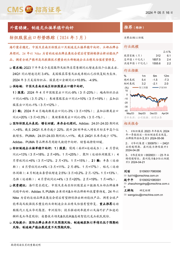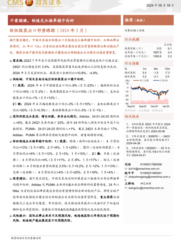 【海通证券】【20240516】纺织服装行业出口形势跟踪(2024年5月):外需稳健,制造龙头接单稳中向好-10页