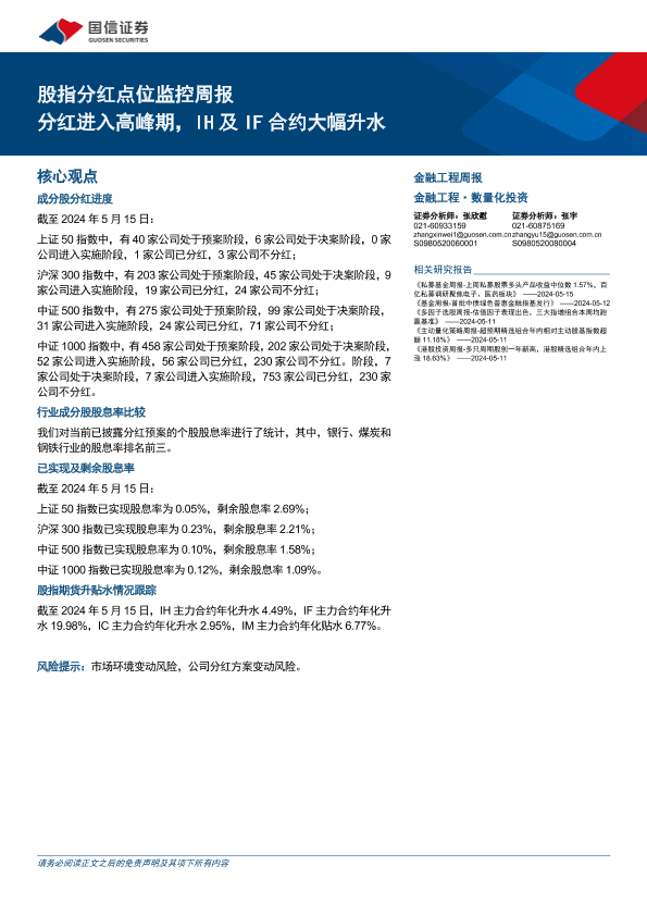 【国信证券】【20240515】股指分红点位监控:分红进入高峰期,IH及IF合约大幅升水-16页