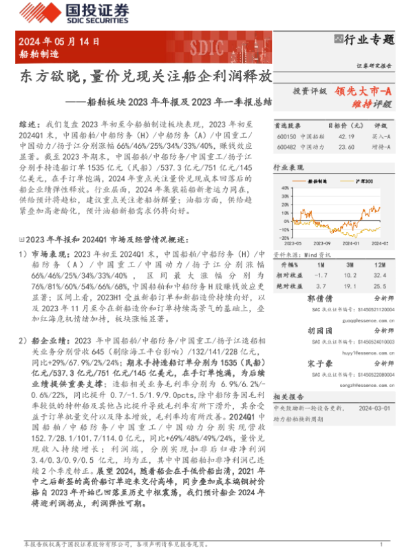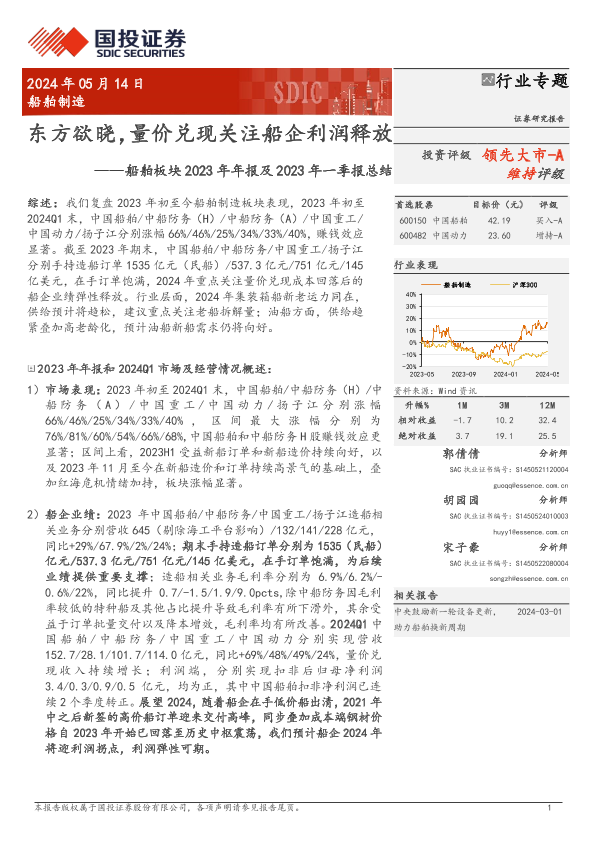 【国投证券】【20240514】船舶制造行业船舶板块2023年年报及2023年一季报总结:东方欲晓,量价兑现关注船企利润释放-16页