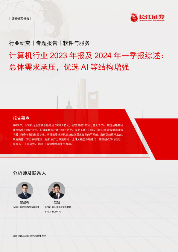 【长江证券】【20230512】计算机行业2023年报及2024年一季报综述:总体需求承压,优选AI等结构增强-24页