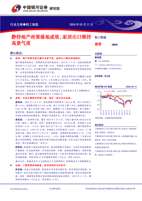【银河证券】【20240511】轻工制造行业月报:静待地产政策落地成效,家居出口维持高景气度-20页