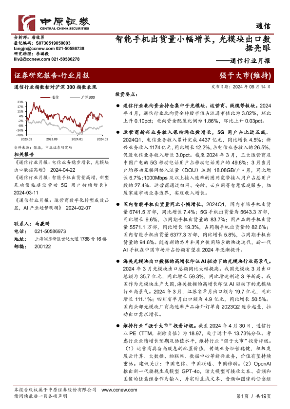 【中原证券】【20240514】通信行业月报:智能手机出货量小幅增长,光模块出口数据亮眼-19页