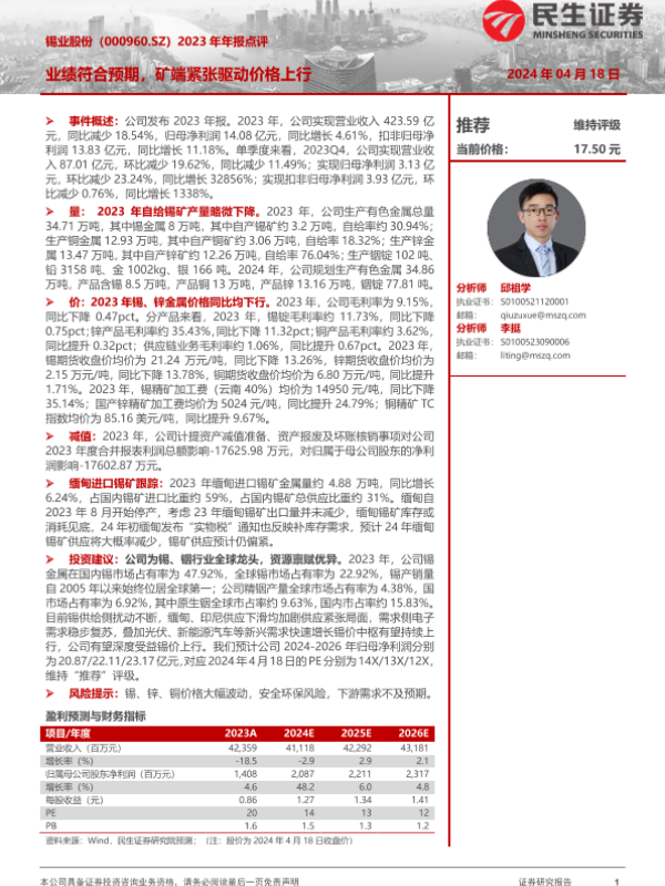 【民生证券】【20240418】锡业股份-000960.SZ-2023年年报点评:业绩符合预期,矿端紧张驱动价格上行-16页