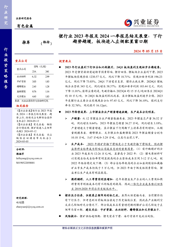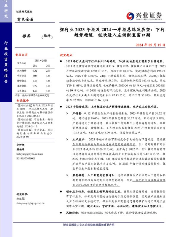 【兴业证券】【20240515】锂行业2023年报及2024一季报总结及展望:下行趋势趋缓,板块进入左侧配置窗口期-15页