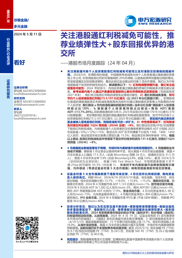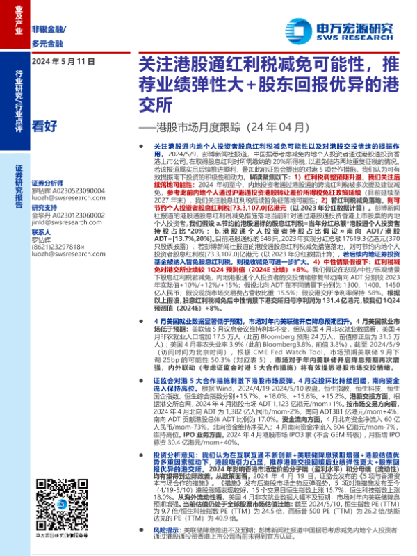 【申万宏源】【20240511】非银金融行业港股市场月度跟踪(24年04月):关注港股通红利税减免可能性,推荐业绩弹性大+股东回报优异的港交所-14页
