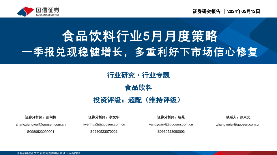 【国信证券】【20240512】食品饮料行业5月月度策略:一季报兑现稳健增长,多重利好下市场信心修复-25页