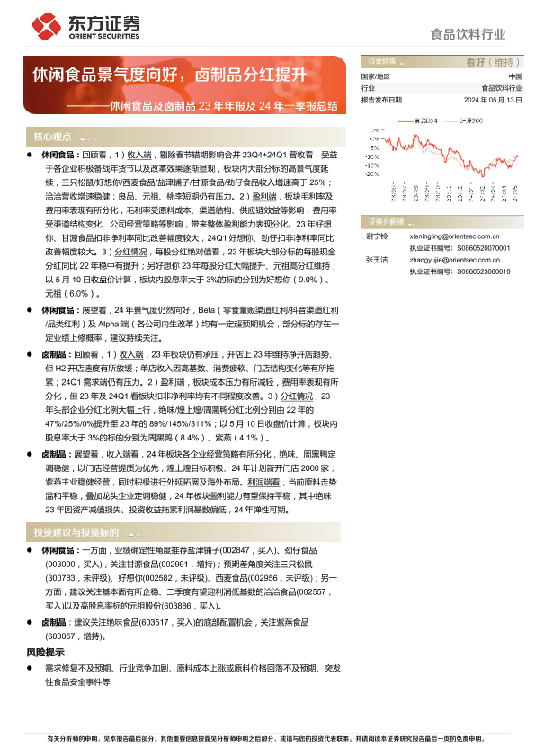 【东方证券】【20240513】食品饮料行业休闲食品及卤制品23年年报及24年一季报总结-12页