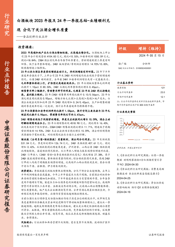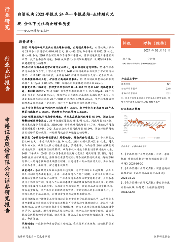 【申港证券】【20240515】食品饮料行业点评:白酒板块2023年报及24年一季报总结,业绩顺利兑现,分化下关注酒企增长质量-12页