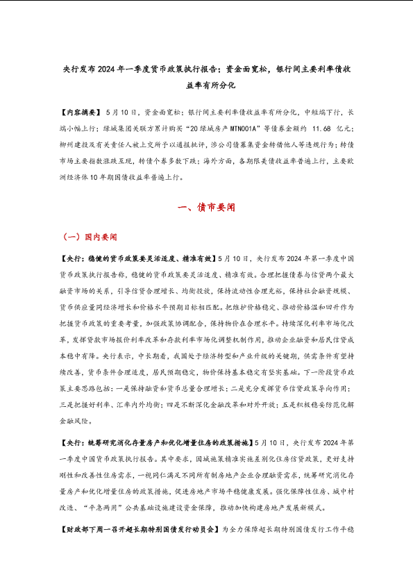 【中国人民银行】【20240510】央行发布2024年一季度货币政策执行报告;资金面宽松,银行间主要利率债收益率有所分化-10页