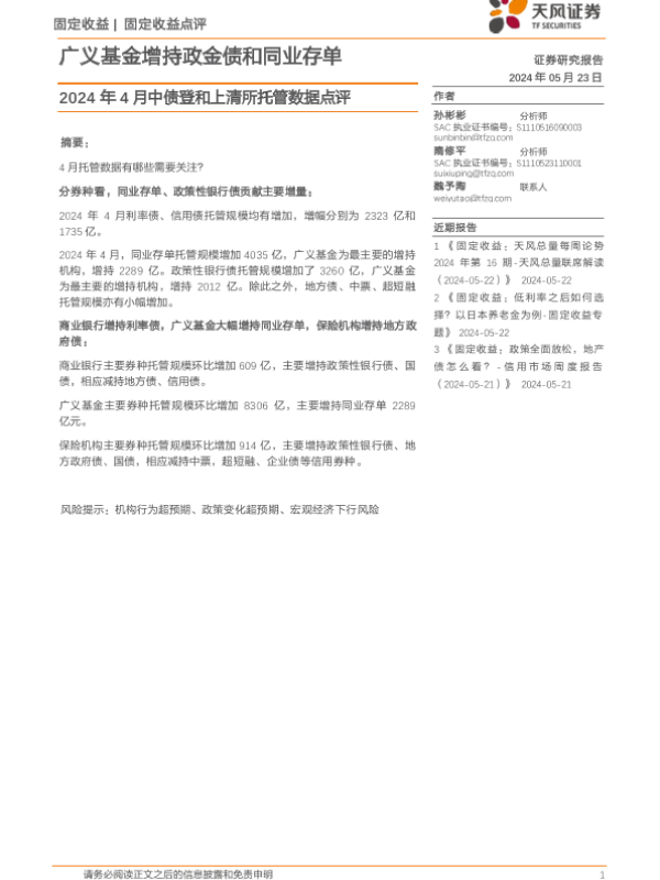 【天风证券】【20240523】2024年4月中债登和上清所托管数据点评:广义基金增持政金债和同业存单-12页
