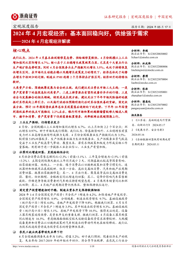 【浙商证券】【20240517】2024年4月宏观经济解读:2024年4月宏观经济,基本面回稳向好,供给强于需求-18页