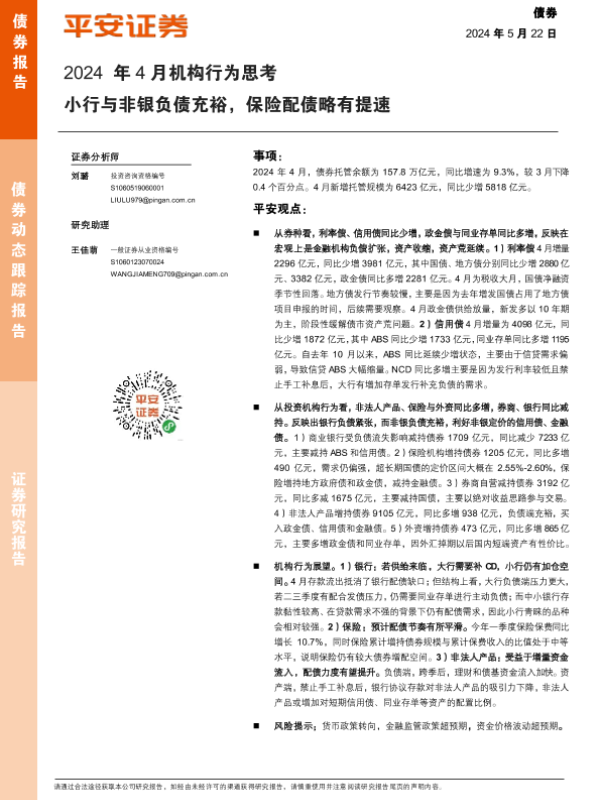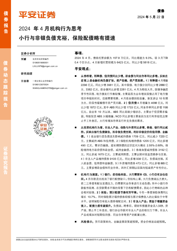 【平安证券】【20240522】2024年4月机构行为思考:小行与非银负债充裕,保险配债略有提速-10页