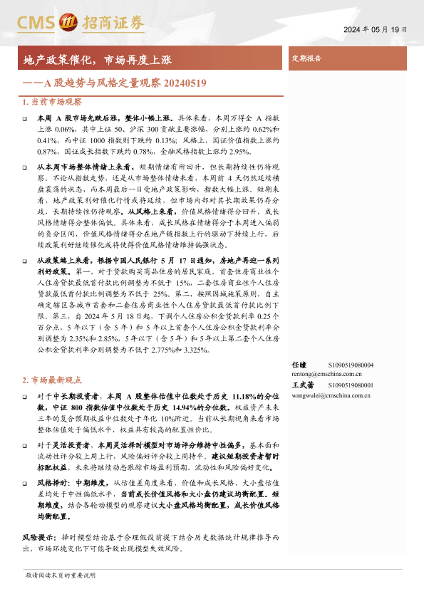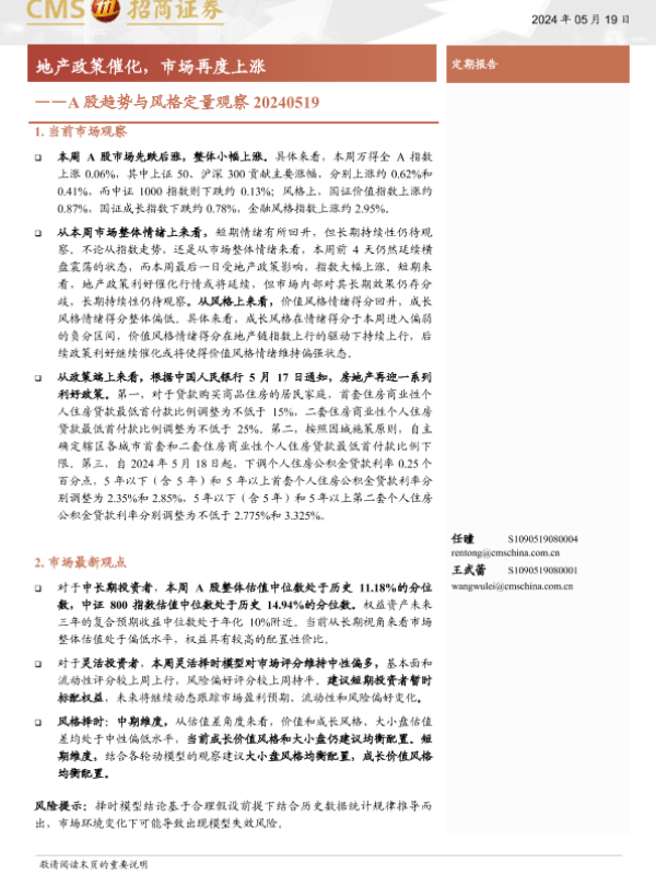 【海通证券】【20240519】A股趋势与风格定量观察:地产政策催化,市场再度上涨-10页