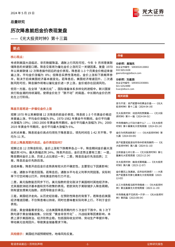 【光大证券】【20240519】《光大投资时钟》第十三篇:历次降息前后金价表现复盘-12页