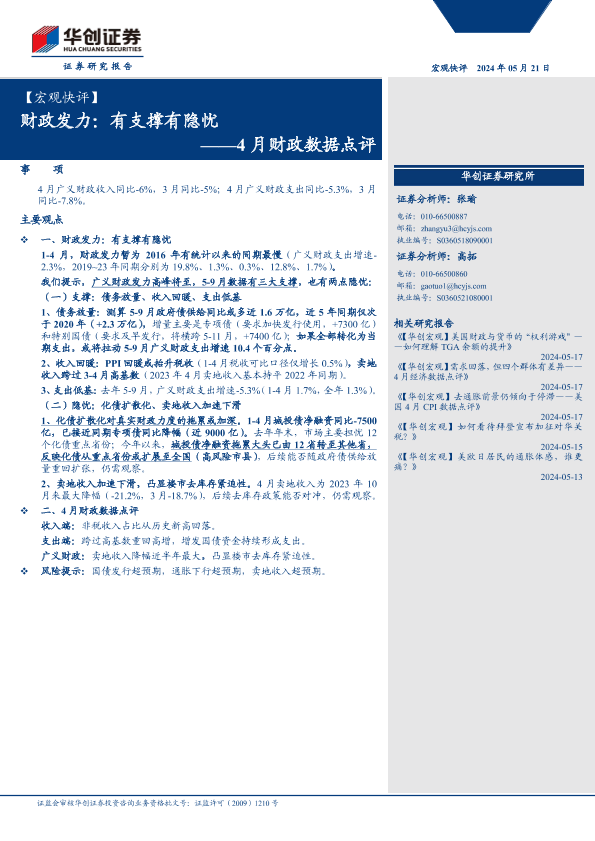 【华创证券】【20240521】4月财政数据点评-财政发力:有支撑有隐忧-14页