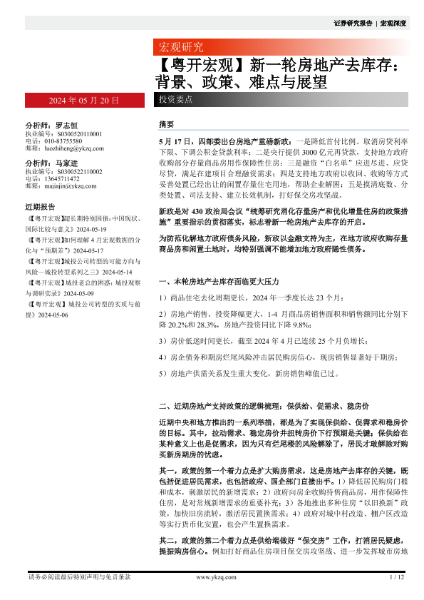 【粤开证券】【20240520】【粤开宏观】新一轮房地产去库存:背景、政策、难点与展望-12页