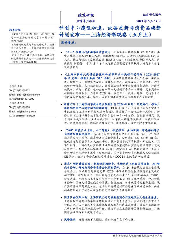 【海通证券】【20240517】上海经济新观察(五月上):科创中心建设加速,设备更新与消费品换新计划发布-12页