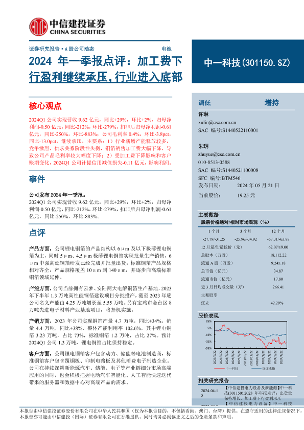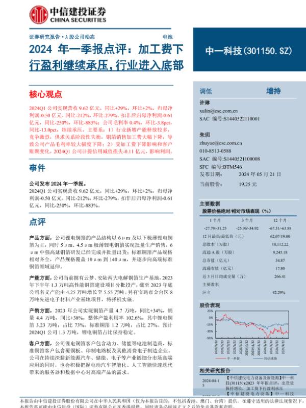 【中信建投证券】【20240521】中一科技(301150)2024年一季报点评:加工费下行盈利继续承压,行业进入底部-11页