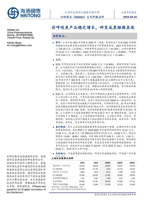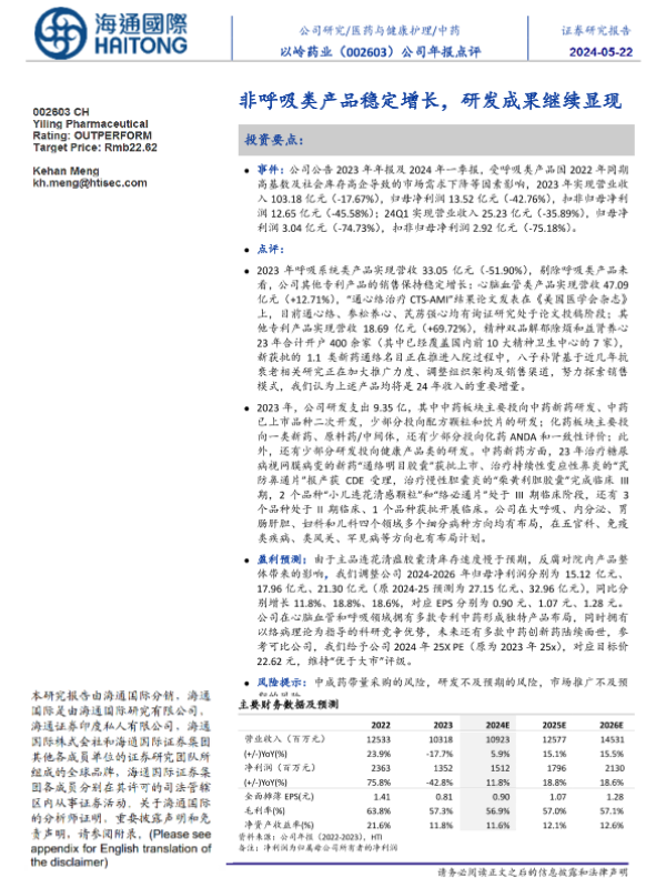 【海通国际】【20240514】以岭药业(002603)公司年报点评:非呼吸类产品稳定增长,研发成果继续显现-11页