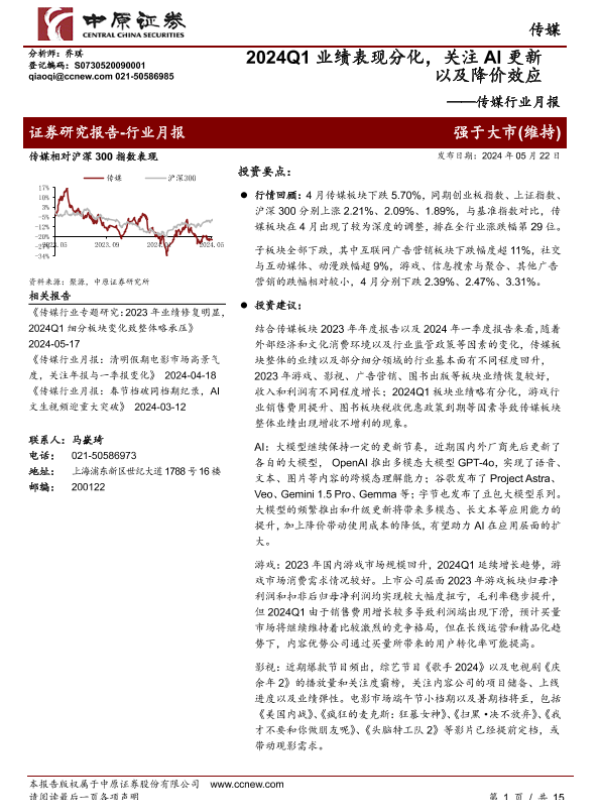 【中原证券】【20240522】传媒行业月报:2024Q1业绩表现分化,关注AI更新以及降价效应-15页