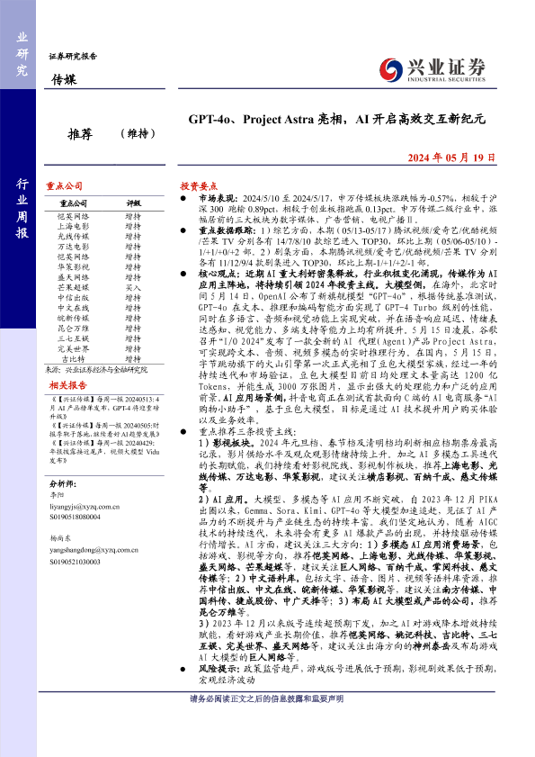 【兴业证券】【20240519】传媒行业:GPT-4o、Project+Astra亮相,AI开启高效交互新纪元-14页