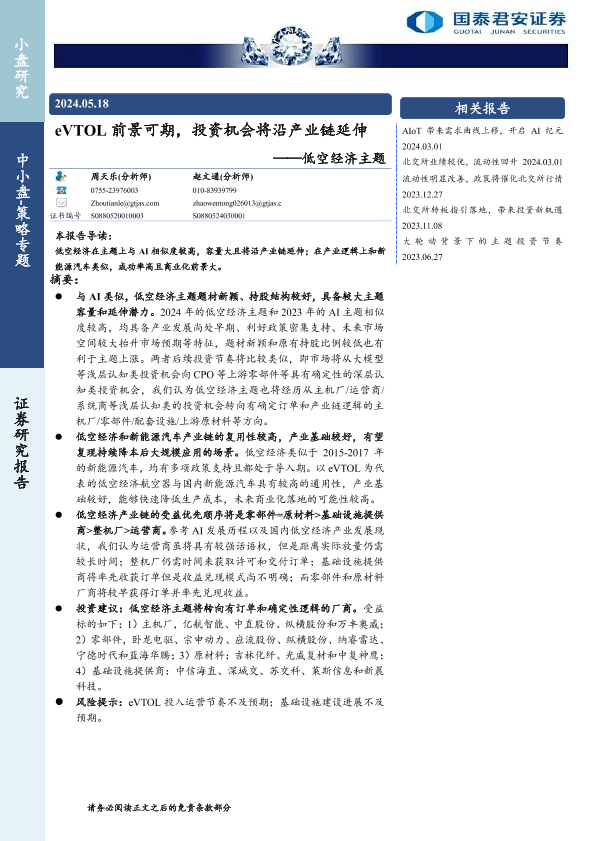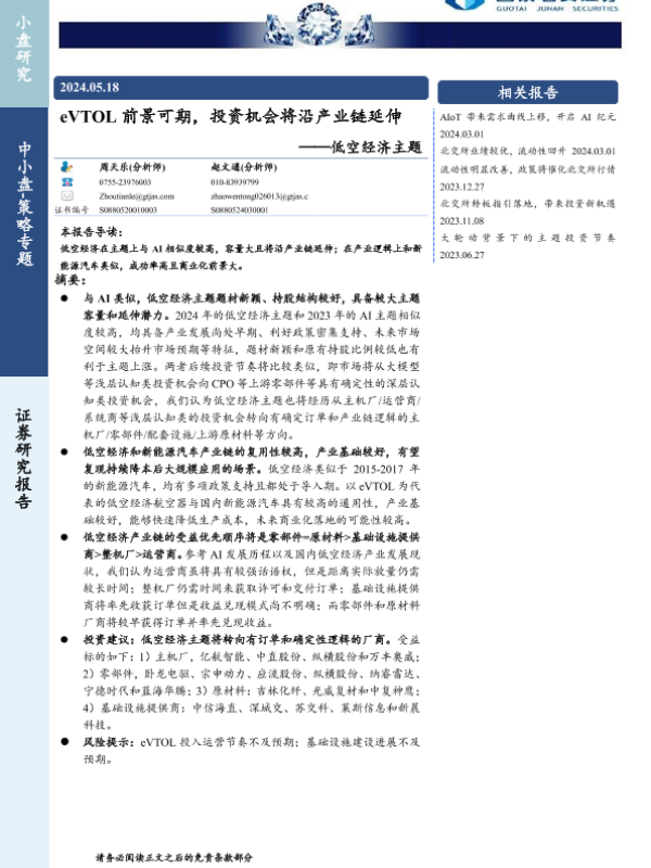 【国泰君安证券】【20240518】低空经济主题:eVTOL前景可期,投资机会将沿产业链延伸-28页