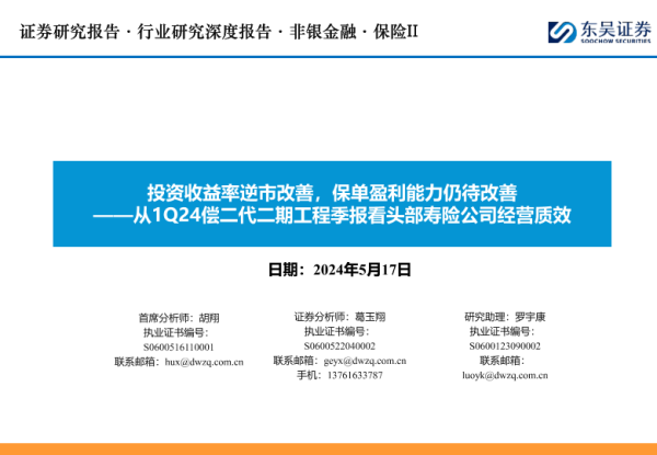 【东吴证券】【20240517】从1Q24偿二代二期工程季报看头部寿险公司经营质效:投资收益率逆市改善,保单盈利能力仍待改善-45页