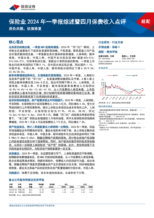 【国信证券】【20240518】保险业2024年一季报综述暨四月保费收入点评:资负共振,估值修复-14页