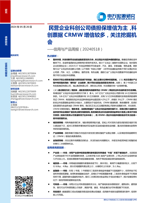 【申万宏源】【20240520】民营企业科创公司债担保增信为主,科创票据CRMW增信较多,关注挖掘机会-14页
